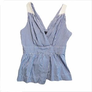 Adorable cotton blouse from Banana Republic. Thin blue and white stripes. Faux crossover front, V neck, sleeveless with pleating detail on shoulders. Size 6.