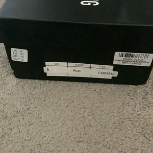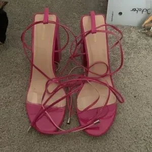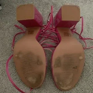 Fair used condition. Hot pink chunky high heels with ankle laces. Clear band at the toes. By Pretty Little Thing. Size 10. Measurements unavailable.