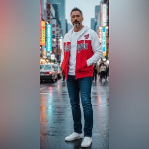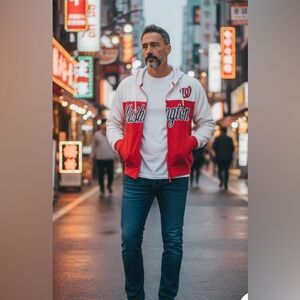 Major-league baseball Washington logo full zipper unisex, long sleeve hooded jacket by New Era. Bold red and white colors. Perfect for casual wear.
