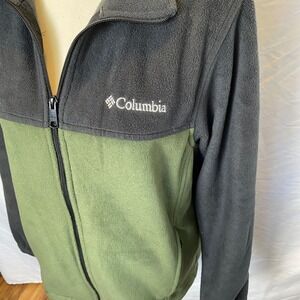 Men's Columbia full-zip fleece jacket in a colorblock design of black and green. This versatile jacket features a stand-up collar for added warmth and a full-length zipper for easy on and off. Its comfortable fleece material makes it perfect for layering during outdoor activities or for casual everyday wear. Ideal for hiking, camping, or simply braving a chilly day.