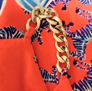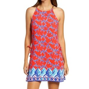 Lilly Pulitzer Pearl romper in Picante Coral Heebee Zeebees print an orange and blue zebra print a halter neckline with gold chain shoulder straps and side bowties zippered back with hook and eye closure