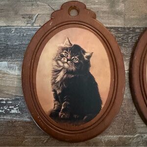 Vintage Victorian style 90s wooden plaque kitten pictures. Kitten pictures printed on wooden Victorian style plaques made to hang. Would be great on an accent wall or as any decor piece for a cat lover! Super cute and in good shape, some minor scuffs and general vintage wear. Both pieces measure, roughly 7 inches long and 5 1/2 inches wide.