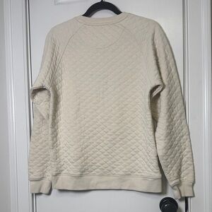 league 91 sweatshirt, quilted crewneck, flagler college sweater, collegiate sweatshirt, cream quilted pullover, maroon embroidered crest, cozy campus style, preppy sweatshirt, casual fall winter top, soft cotton blend sweater, university logo sweatshirt, league heritage fleece