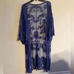 Flowy navy cover-up with intricate embroidery. Lightweight and stylish. L x W = 49 in x 21 in; sleeves 21 in