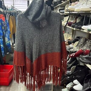 Stylish gray poncho with a red fringe and hood. Perfect for layering.