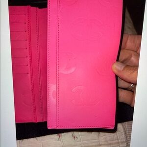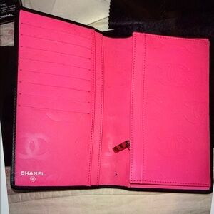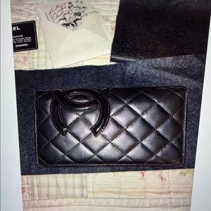 Luxurious black quilted leather wallet. Features iconic CHANEL logo. Timeless elegance. One mark shown