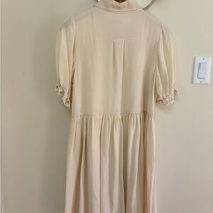 Chloe midi dress in cream. Features button accents and puff sleeves. The kind of prom and proper look that’s secretly very sexy. Lines skirt makes it easy for all seasons. Easily worn oversized as a babydoll type look. Great with a chunky loafer and socks.