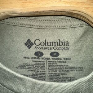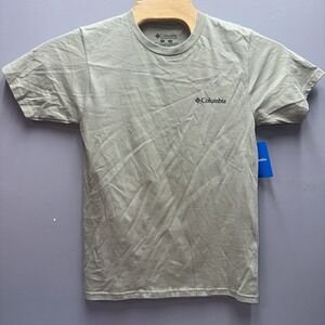 The NWT Columbia MENS Rockaway River Back Tree Flag Graphic SS T-Shirt in size Small features a solid pattern with short sleeves and a crew neck neckline.