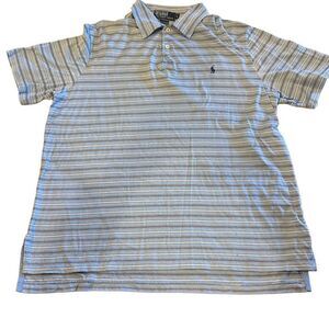 Men’s Polo by Ralph Lauren Blue & White Horizontal Stripe Short-sleeve Collared Shirt. ~22.5” pit to pit. 27” shoulder to front hem. Gently worn. Size L.