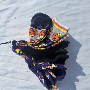 Vibrant crew socks with candy corn and sweet treats. Ideal for Halloween fun.