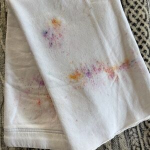 Soft white terry cloth top and Malibu style pants set. Features classic Frank & Eileen label as pictured. Set was folded in closet and never worn. Crisp white with tie dye splatter paint design