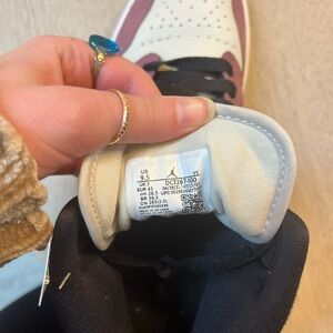 Nike high-tops with a mauve and white color scheme. Features black accents and iconic logo. Ideal for everyday style.
