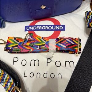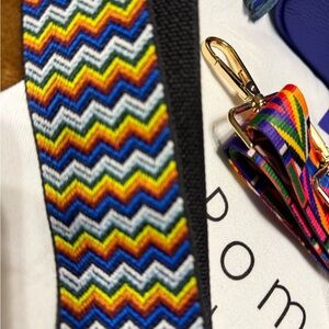 Stylish blue women's bag featuring a vibrant multicolor strap. Perfect for adding a pop of color to any outfit. Used once. Has all the bag charms and an extra strap