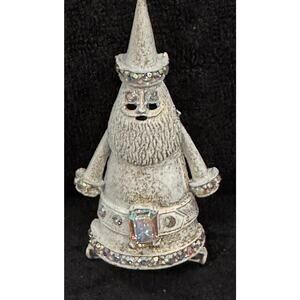 Add whimsical holiday charm to your collection with this vintage white Santa Christmas pin featuring iridescent rhinestones along the hat, cuffs, and trim. Measuring approximately 1.25 x 2.5 inches, this stylized Santa figure has a textured finish, sparkling jewel-accented belt, and a unique old-world design that stands out beautifully on coats, scarves, and holiday attire. The pin mechanism is secure and functions well. A wonderful gift for collectors of vintage Christmas jewelry or anyone who loves festive statement brooches. Preowned, gently worn, and full of nostalgic character.
