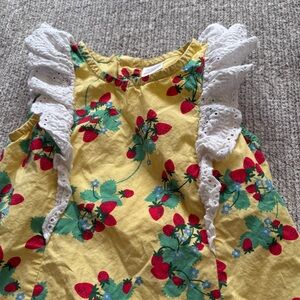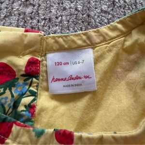 Adorable Hanna Andersson girls’ sundress in size 120 cm, featuring a cheerful strawberry print on a sunny yellow background. White eyelet ruffle sleeves add a sweet, classic touch. Made from 100% cotton for breathable comfort, with both the shell and lining in soft cotton.