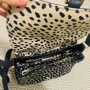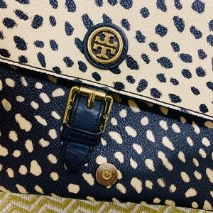This Stunning Kerrington Crossbody Bag By Tory Burch furnishes the organization with three divided interior sections and shows off a big personality in spotted vinyl with leather trim.