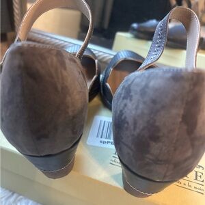 Elegant L'Artiste heels featuring a unique scalloped design. Crafted in rich brown and tan hues with a comfortable ankle strap. Perfect for adding a touch of sophistication to any outfit.