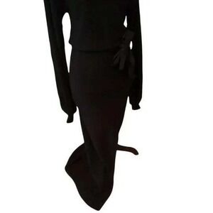 A NWT striking black knit maxi dress designed for a flattering silhouette. This dress features long sleeves with a subtle cutout detail on the upper chest and a high slit on the left leg for added flair. The waist is accentuated with a self-tie belt, creating a cinched effect. Perfect for evening events or a sophisticated daytime look.
