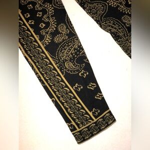 Gorgeous soft sweater knit leggings from Free People! A beautifully bold, black & gold paisley bandana design. Stylish & stretchy, polished yet cozy! Perfect for a dramatic winter layered look! Excellent condition - light wear, some pilling on upper inner thigh / crotch area (see photos)