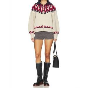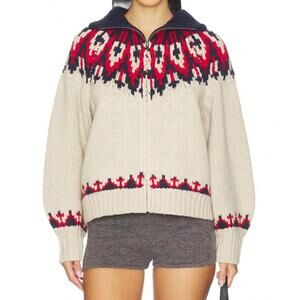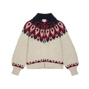 Introducing the Nordic Sweater by THE GREAT., a wool blend piece crafted for warmth and style. This Glacier Fair Isle sweater boasts long sleeves with a slight bubble for added flair and features a versatile collar that can be worn open or with a zip closure for added warmth. Composition: 80% Lambswool, 20% Nylon. Care: Hand wash. Imported. Perfect for fall and holiday gatherings, this sweater brings a boho chic allure to any Thanksgiving or holiday party.