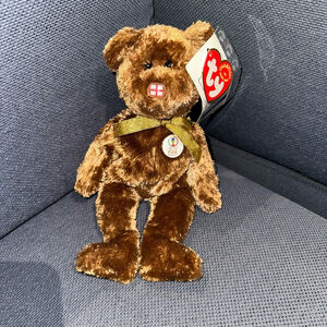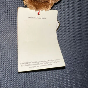This is a new with tags Ty Beanie Baby "Champion" England bear. It is brown, with a red stitched nose and gold ribbon. The bear features a 2002 FIFA World Cup commemorative badge. The bear is made of polyester fiber and plastic pellets. It has a Ty heart-shaped tag and additional tags indicating it is a licensed product of the 2002 FIFA World Cup. The bear is approximately 6 inches tall and in excellent condition. All materials appear to be new and undamaged. The item is in its original packaging.