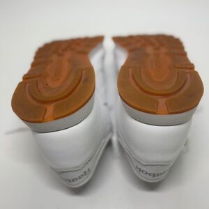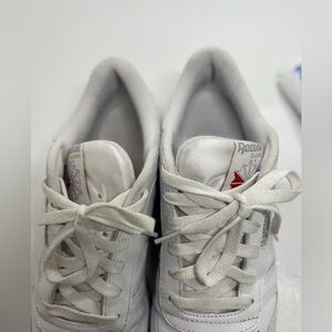 Crisp white Reebok sneakers with durable gum soles. Ideal for everyday style.