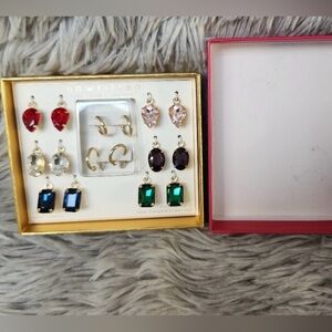 Chic gold earrings with vibrant charms. Includes red, pink, silver, black, and green options. Perfect for versatile styling.