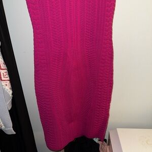 Elegant magenta midi dress. Features a textured knit design. Sleeveless with a keyhole neckline.