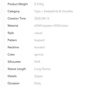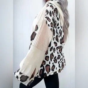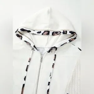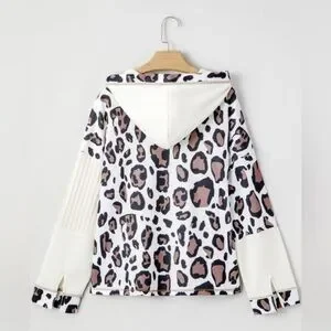 Stylish leopard print zip-up hoodie with cream accents. Perfect for casual wear.