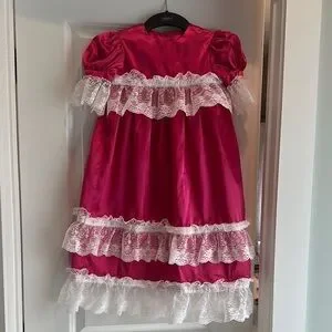 Charming, heirloom style, pink dress with lace details. There is no size information available, but it is 32 inches long from shoulder to hem which I think is about a 5t approximately. There are some tiny snags in the fabric that aren’t really noticeable (pictures are in the listing).