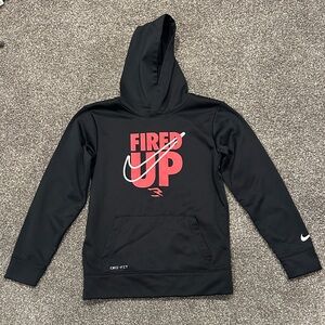 Black hoodie with bold red 'Fired Up' design. Comfortable and stylish. Ideal for active kids. Like new!