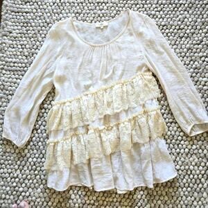 Romantic Boho Gauze women top size small, cream colored with dreamy tiered lace ruffles.