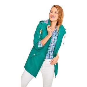 Women’s Size Small Petite…..Pit/Pit:19”…..Sleeves:22.5”…..Top/Bottom:27”…..Talbots Classic Raincoat. Green with Blue & White Gingham Lining, Button up, Removable Hood,Front Pockets, Waterproof Fabric, extra buttons!!