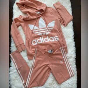 Cozy pink hoodie with iconic trefoil logo. Matching leggings with 3 stripe detail. Perfect for casual wear. Sweatshirt size xs and leggings size small.