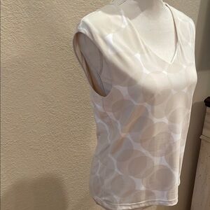 This elegant cream tank top features a scoop neckline and a sleeveless design, adorned with polka dots for a touch of sophistication. The relaxed fit and subtle sheen make it perfect for dressy-casual occasions. This is a new top without tags. The bust does have lining.