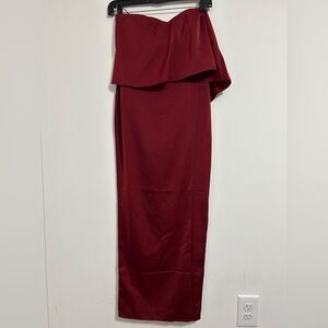 Chic strapless design. Rich burgundy hue. Perfect for evening events.