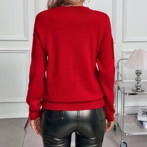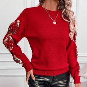 This casual Christmas pullover sweater features a round neck and wrist-length sleeves. It's adorned with sequins for a festive touch. The red color gives it a vibrant look, perfect for the holiday season.