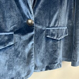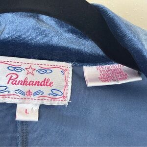 Panhandle blue velvet blazer. Size L. Experience elegance with this deep blue velvet blazer, perfect for adding a touch of sophistication to any outfit. No pockets.