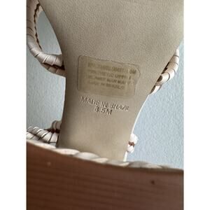 The product is a pair of Steve Madden woven knot heels in size 8.5 for women. These strappy heels are made of leather with a beige color, giving them a stylish and elegant look. Perfect for adding a touch of sophistication to any outfit, these heels are a versatile and trendy choice for any fashionista.