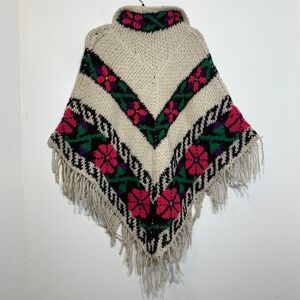 Chunky Knit Floral Bohemian Poncho Cream Multi Color Fringe Collar Vintage