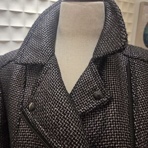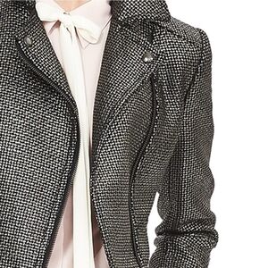 Edgy-meets-classic Banana Republic moto blazer in a gunmetal metallic basketweave tweed. Asymmetrical front zip with snap lapels, zip cuffs, princess seams, and raw-fringe hem for a polished biker-jacket vibe.