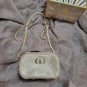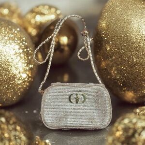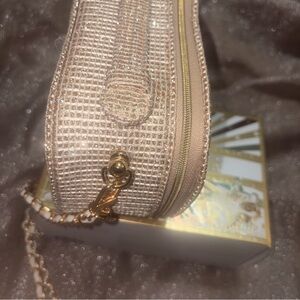 Chic and stylish Sparkling gold metallic Evening Crutch bag or crossbody bag. Perfect to Carry your essentials. Was upcycled ..This cute bag brings luxury and Glamour to your outfits. L 6.5"xH 4"x W 3" NIB. No tags. Plastic film still on logo and zipper pulls. GWP!