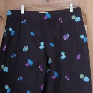 Wonderful embroidered pants. Think beach! Side zip. Size 14 measures 34 at waist, 44 at hips. 12 inch rise, inseam 24.Super cute, cropped and NEW.