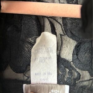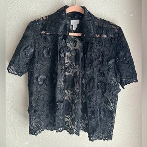 Black lace with scalloped detailing and floral embellishment throughout. Open front with collar. Perfect to wear over a cocktail or formal dress!