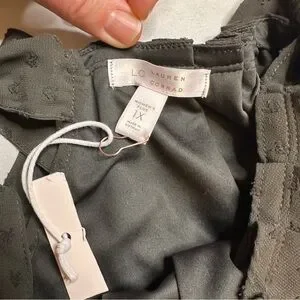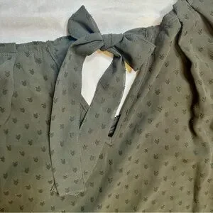 Super cute and feminine LC Lauren Conrad blouse in a soft charcoal/gray dotted jacquard. New with tag! Features sweet tie-shoulder accents, a flowy silhouette, and a fully lined interior for comfort. Great for work, brunch, or layering all year round.