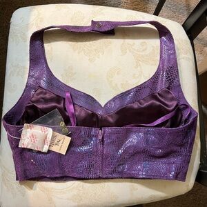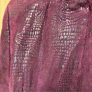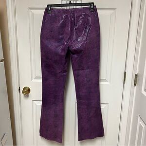 This elegant purple pantsuit is perfect for adding a touch of sophistication to any wardrobe. Its sleek design and vibrant color make it a standout in any collection. Halter bralette. Jacket with front zipper. Wide leg pants. Pants have front zipper. Jacket size small. Bralette size small. Pants size six. Gorgeous three piece pantsuit! A few small, subtle places with lighter shading. Fully lined. Light weight.