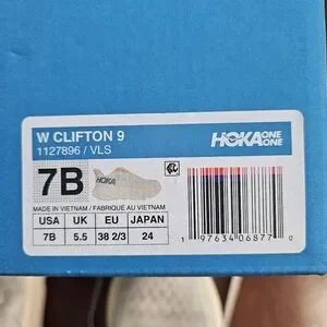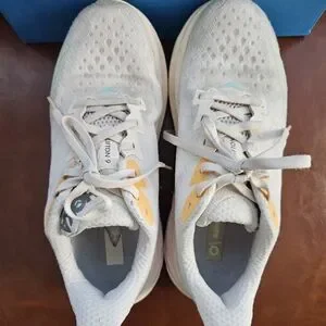 HOKA Clifton 9 size 7 womens. worn for indoor workouts only. Neutral shoe with max cushion. signs of wear across top of shoes from the foot straps of a rower. please see all pictures for wear and ask questions. box included. smoke free home.