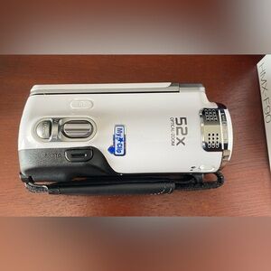 Samsung HMX-F90 offers HD video with 52x optical zoom. Compact design with easy-to-use features. Ideal for capturing special moments. Box is open and camera was tested to ensure functionality but otherwise new.