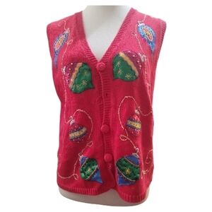 Vibrant red knit sweater vest featuring colorful ornament designs embroidery and beading. Perfect for festive holiday occasions. Missing one button otherwise no callouts. Measures approx 20" pit to pit across back. Check out my closet and bundle to save. Bundles over 5 lbs will require purchase of extra postage. Offers always welcome. Non smoking cat friendly home. Bookmark my closet as new items added weekly. Thank you for shopping my closet.