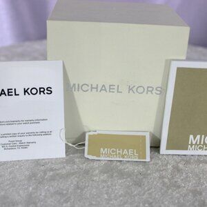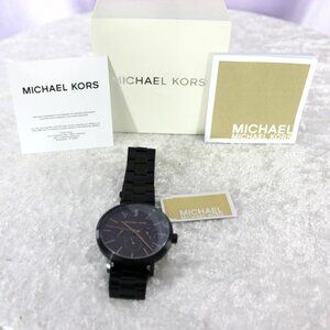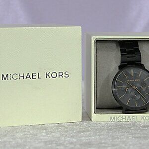 Brand new Michael Kors MK8703 men’s black stainless steel watch featuring elegant gold-tone accents and a sleek chronograph-style face. This watch is brand new with original box, warranty booklet, and tag included. It has never been worn and was only removed for photos. Minor scuffing on the outer box from storage only. A classic luxury accessory that works perfectly for everyday wear, business attire, or special occasions. Beautiful gift-ready presentation.